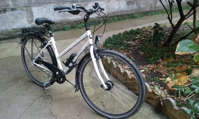 Vlo femme blanc marque Velodeville A450 premium, 8 vitesses, cadre trapze 50 cm.Vendu avec 2 sacoches noir et un bon antivol .