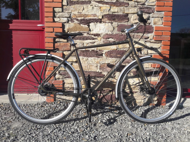 Avec un Porte-bagages, clairage avant et arrire (dynamo intgre dans la roue avant), Garde-boue et Bquille