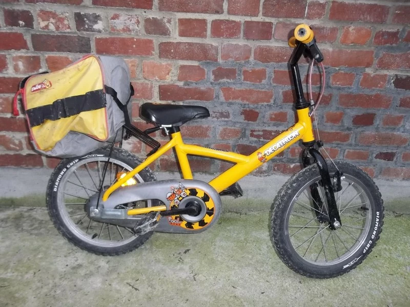 Vends vlo dcathlon jaune, avec sacoche « coffre » de transport et sonnette, en bon tat, freins ok.n’hsitez pas me contacter pour + d’infos!